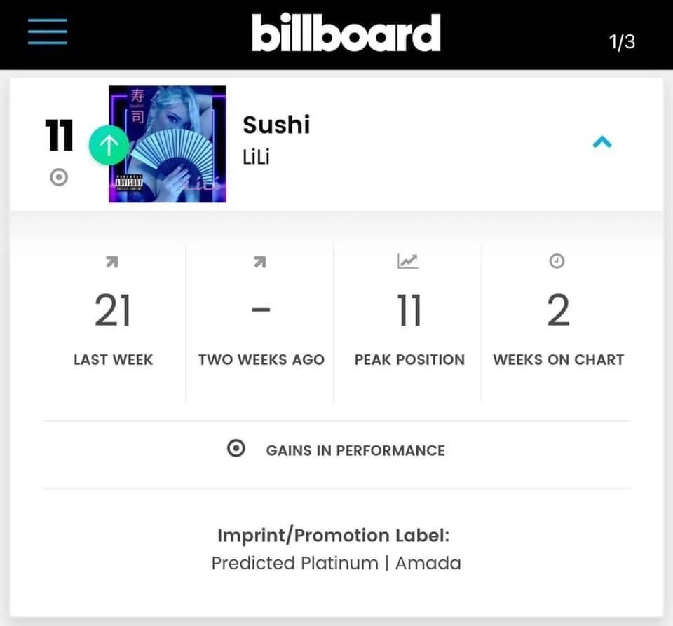 LiLi is mostly known for her successful debut on the Billboard Music Chart. The hit single, ‘Sushi’ peaked at #11 and has remained on the chart for 4 weeks and continues.